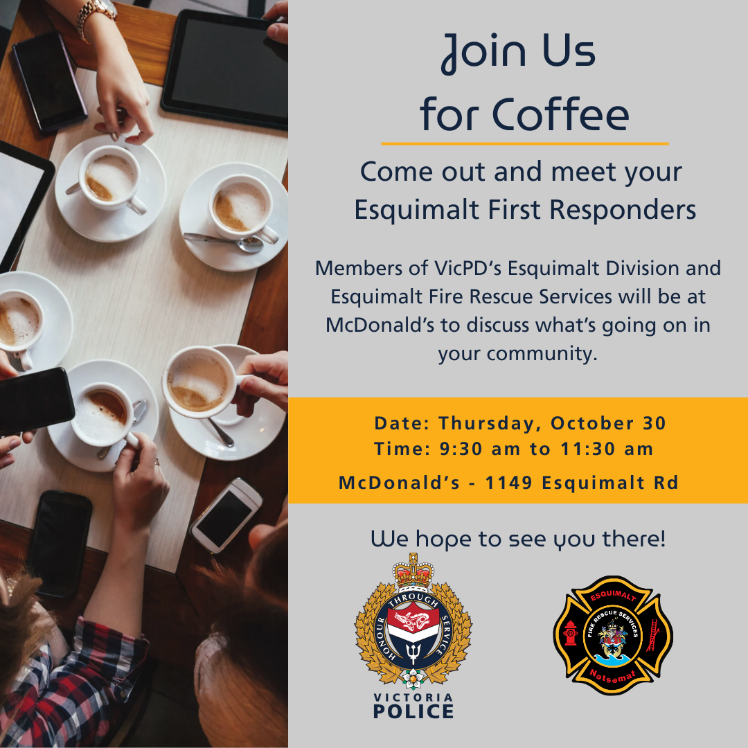 Members of VicPD's Esquimalt Division and Esquimalt Fire Rescue Services will be at McDonald's to discuss what's going on in our community.