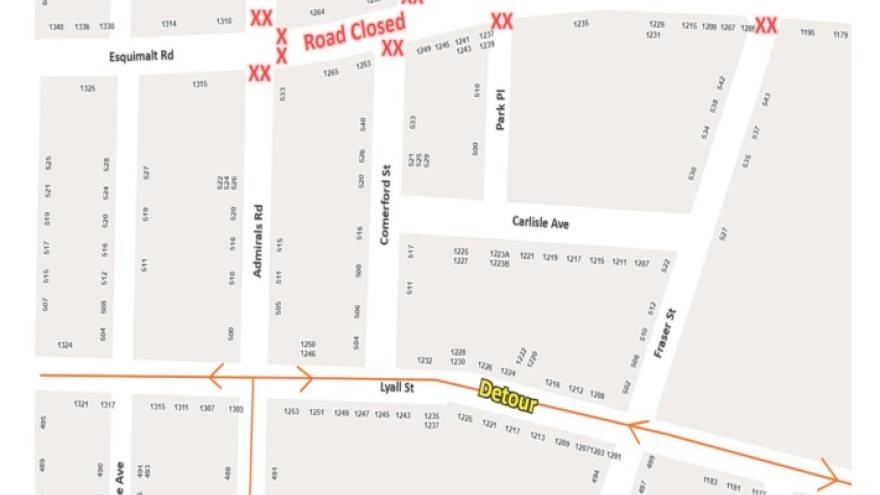 Esquimalt Road will be closed from Admirals Rd to Joffre St from 4:30-6:00pm for the Celebration of Lights Parade. Additionally there will be no parking along the route from 2:00-6:00pm.
