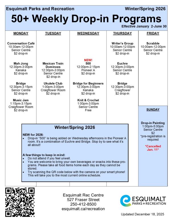 Esquimalt Recreation Centre offers a wide variety of programs designed specifically for adults 50 years and older, including art & creative, social, fitness, sports, music, dance, board games, cards and much more! Minimum registration must be met 3 days prior to the start of the program, please register early.